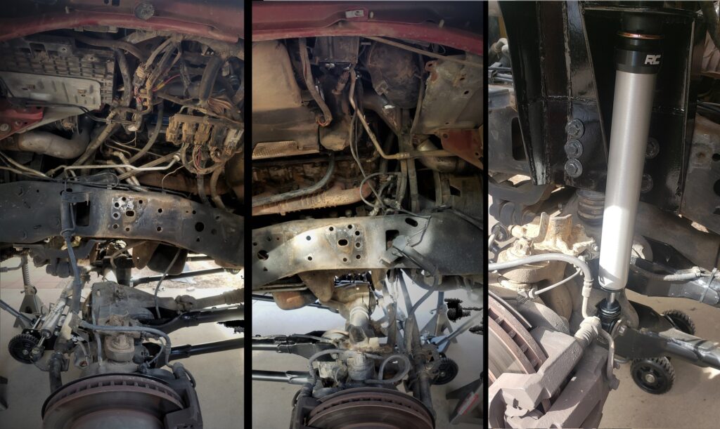 The biggest challenge when making room for the extended coil buckets are that the air conditioning dryer must be moved up. We were able to re-bend the lines and make a relocation bracket to remount it securely in its new position. Shown here are panoramic photos with the fender liners, and factory coil buckets removed; also shown is the axel hitting on the factory bump stops without the shock bottoming out.
